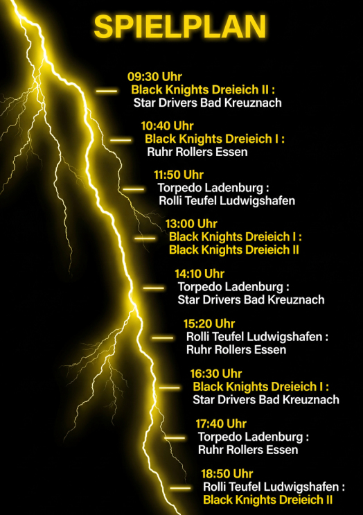 Unsere „Black-Knights I“ spielen um 10:40 Uhr und 16:30 Uhr und unsere „Black-Knights II“ um 09:30 Uhr und 18:50 Uhr. Um 13:00 Uhr findet das Derby zwischen unseren beiden Mannschaften statt.